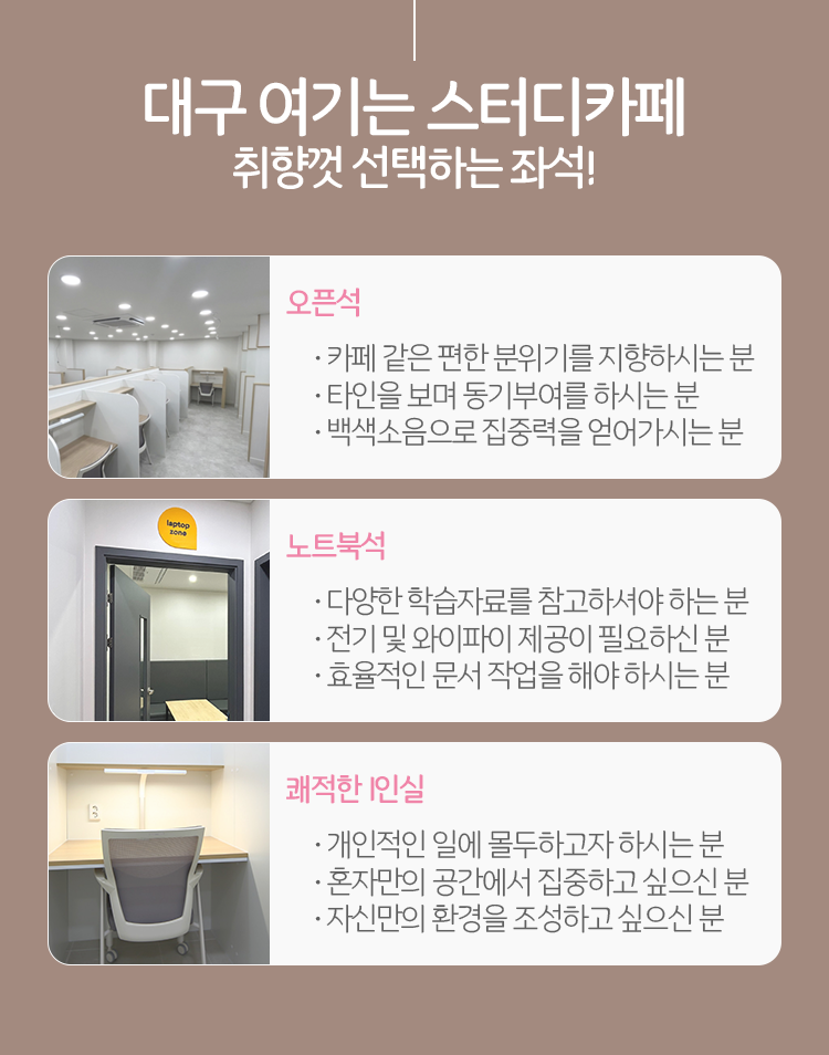 효서로 1인실 스터디카페는 오픈석과 1인실, 노트북석이 구분되어 있어 필요에 따라 선택할 수 있습니다. 백색소음과 함께 친구와 함께 공부하고 싶은 분들은 오픈석을 선택할 수 있습니다. 다른 사람들과 함께 공부를 할 수 있지만 좌석끼리 거리가 있기 때문에 보다 편안하게 이용할 수 있습니다.