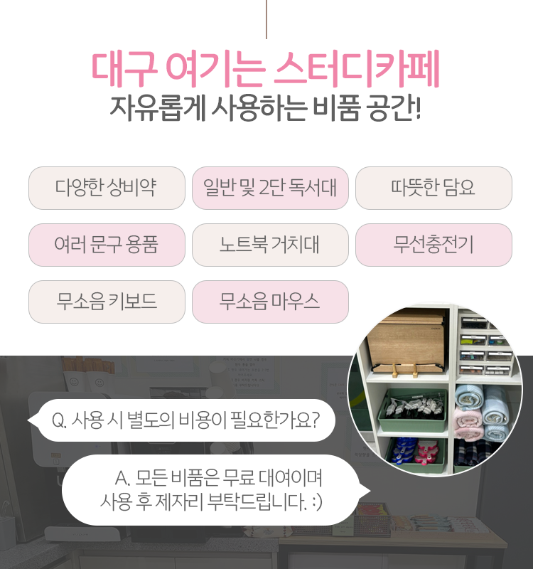 만실인 경우에는 기간권 판매수량이 제한될 수 있어 참고바랍니다. 책이나 두고 다녀야할 짐이 만다면 사물함을 이용해보세요. 저희는 지정된 시간에 청소와 관리를 하고 있습니다. 조금의 소음이 발생할 수 있어 양해부탁드립니다. 24시간 운영하고 있는 여기는 스터디카페, 언제든 필요하다면 방문해보세요. 그리고 궁금한 점이나 문의사항은 고객소리 게시판에 남겨주시거나 배너아래 번호로 전화주시면 친절히 도와드리겠습니다. 많은 분들이 편리하고 이용하며, 쾌적한 공간에서 시간 보내실 수 있도록 최선을 다하겠습니다. 감사합니다.